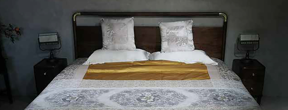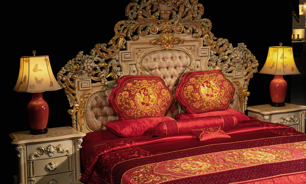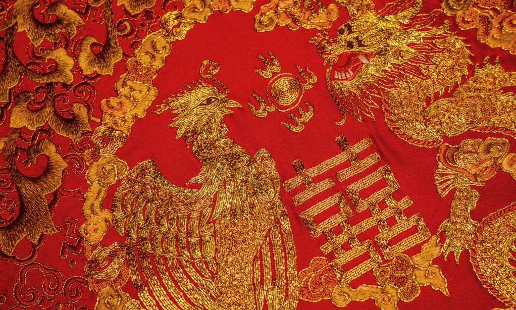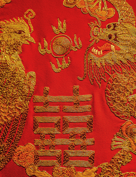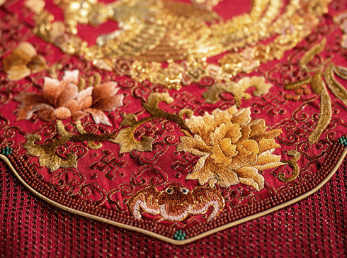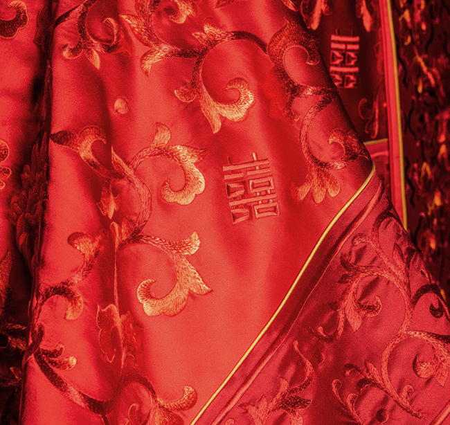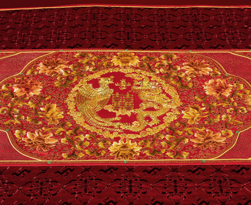 “华鼎龙凤”绣法运用了盘金绣、绒绣、勾金绣、打籽绣、抽纱绣、珠绣等多种工艺,将皇家最高代表的刺绣工艺融为一体。整套床品盘金工艺达 5000 米, 勾金工艺 10000 米, 工艺金丝用料 15000米,采用天然红玛瑙 28000 颗, 绿松石 360 颗勾边走线, 天然宝石勾勒的红喜字低调奢华,灵动立体,祝福感满满。